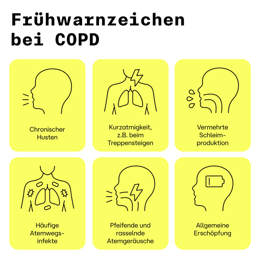 Wenn du Symptome wie anhaltenden Husten, Auswurf oder Atemnot bemerkst, sprich mit deiner Hausärztin oder deinem Hausarzt. Es ist wichtig, dass deine Beschwerden frühzeitig abgeklärt und richtig behandelt werden. Denn je früher die Erkrankung erkannt wird, desto besser kann ihr Verlauf positiv beeinflusst werden.