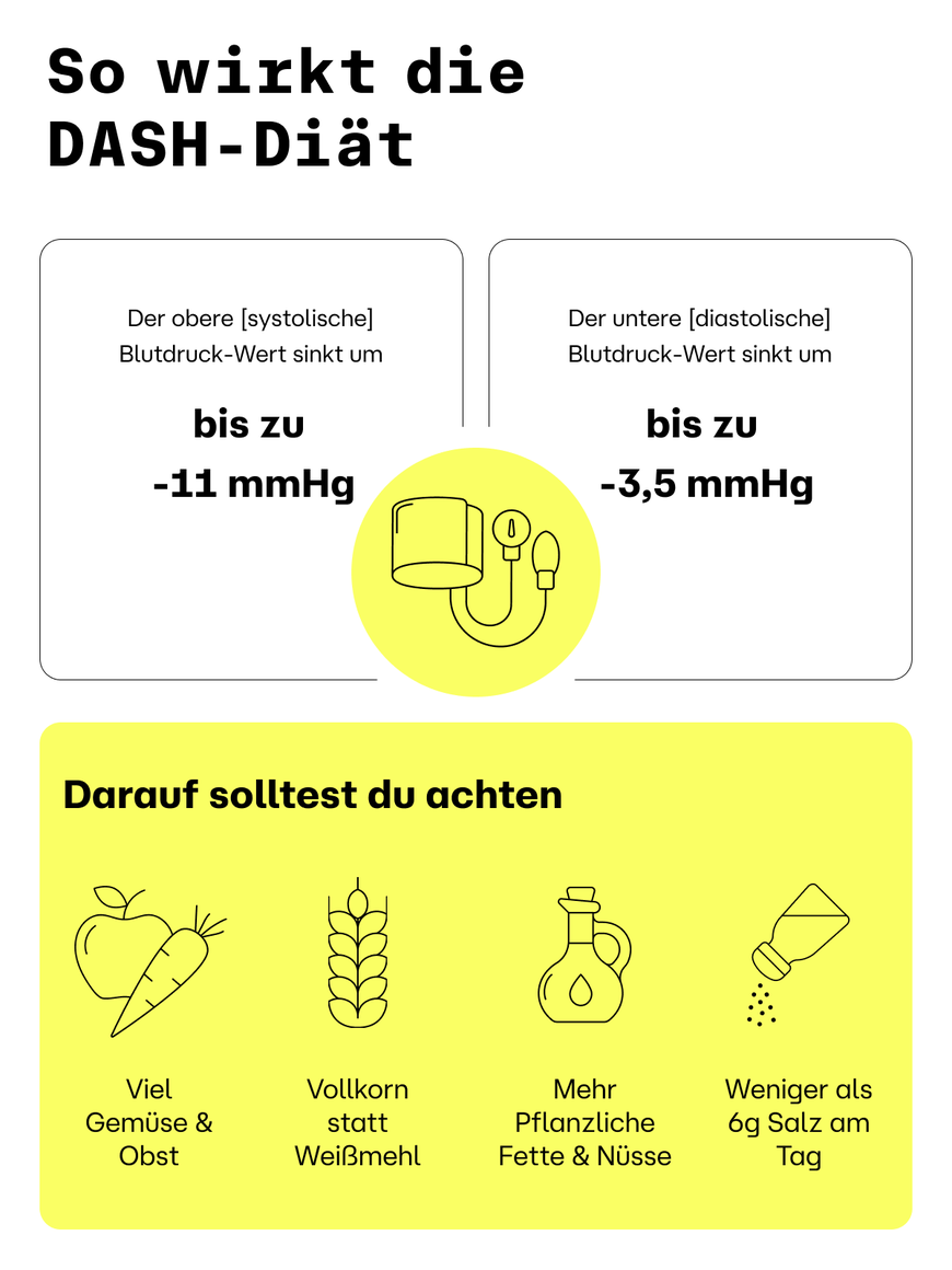 Hört sich gut an, oder? Trotzdem solltest du jetzt nicht gleich versuchen, alle DASH-Empfehlungen (s. unten) sofort von heute auf morgen umzusetzen. Gehe behutsam, schrittweise vor und gib deinem Körper etwas Zeit, sich umzustellen. Sprich vorher unbedingt auch mit deiner Ärztin oder deinem Arzt, wenn du bereits wegen Bluthochdruck in Behandlung bist.