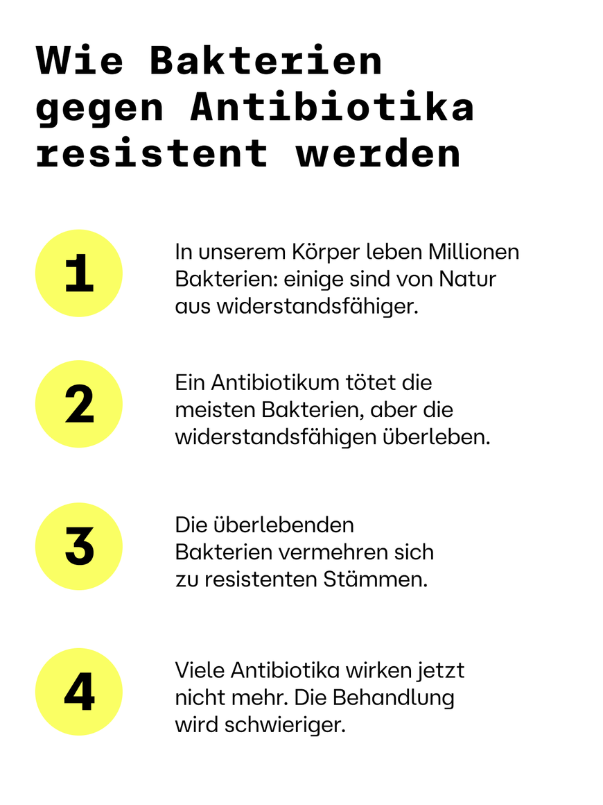 Resistenzen entstehen hauptsächlich durch falschen Gebrauch: Wenn Antibiotika zu häufig, unnötig oder nicht korrekt eingenommen werden, können Bakterien unempfindlich werden. Diese „resistenten“ Bakterien lassen sich dann schwerer behandeln und können zu gefährlichen Komplikationen führen.3