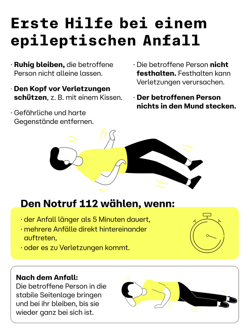 Wenn ein Anfall länger als fünf Minuten dauert oder mehrere Anfälle direkt hintereinander auftreten, ohne dass du zwischendurch wieder zu dir kommst, handelt es sich um einen medizinischen Notfall, den sogenannten Status epilepticus. In diesem Fall ist sofortige ärztliche Hilfe erforderlich. Ruf am besten einen Notarzt (112).