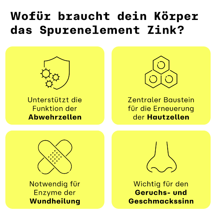 Dein Geschmacks- und Geruchssinn: Das Spurenelement unterstützt deinen Körper dabei, die dafür notwendigen Sinneszellen regelmäßig zu erneuern. Ein Mangel kann dazu führen, dass Speisen weniger intensiv schmecken oder Gerüche schwächer wahrgenommen werden.1,3